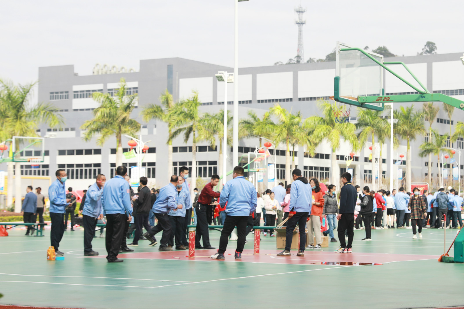 春节来临前,挂满灯笼和彩旗的主干道,洋溢着节日气氛的鲜花和公橘子树,处处呈现出喜庆、祥和的景象。正月初一,一场为就地过年员工举办的“情暖新春”活动在篮球场展开,活动精心设置了欢乐套圈、快乐投篮、趣味竞答、精准投壶、夹元宝、下象棋赢话费等项目,还有财神爷和牛年玩偶现场为大家发放糖果。